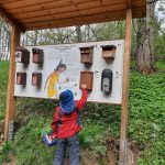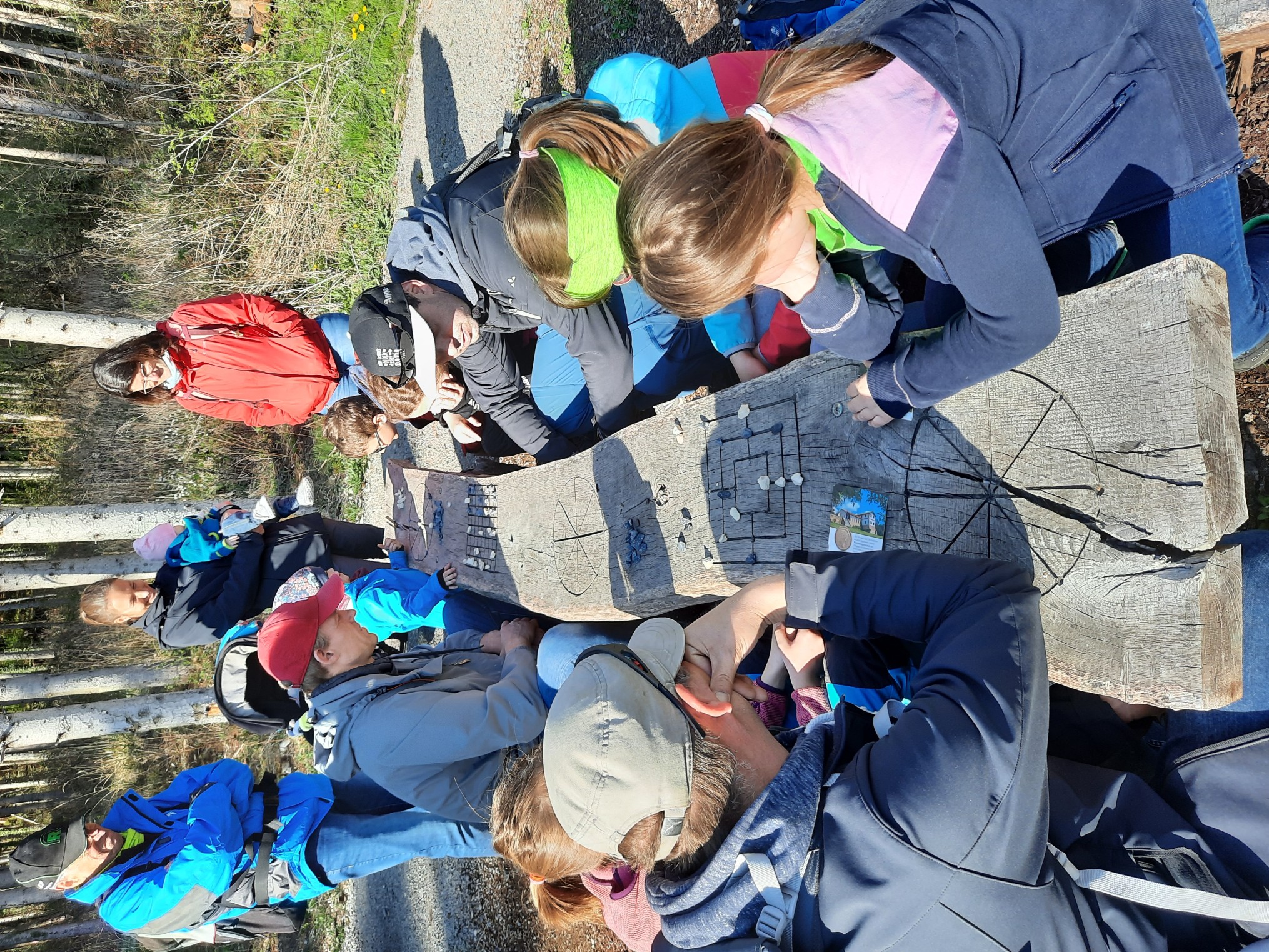 Durch den Wald wanderten wir zu der ersten Spielstation – Baumstumpfhüpfen. An dieser Station konnten die Kinder ihre Balancefähigkeit austesten. Den darauffolgenden leichten Anstieg nach Bechtoldsweiler meisterten die Kinder spielend mithilfe der zweiten Station. Sie mussten Holzfiguren erspähen und zählen, welche sich am Wegesrand befanden. Oben angekommen wartete auch schon die dritte Spielstation – eine Slackline. Während die Kinder ihren Gleichgewichtssinn testen konnten, genossen die Erwachsenen den Weitblick auf die Albhochfläche und die Burg Hohenzollern. Zwischen Wiesen und Obstbäumen ging es dann neuen Abenteuern entgegen. Ein XXL Memory war die vierte Station. Dort war die Merkfähigkeit aller Mitspieler gefragt.